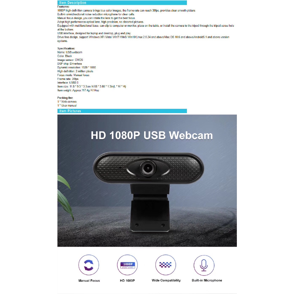 Amazon Com 1080p Usb Webcam 2mp 30fps Manual Focus Computer