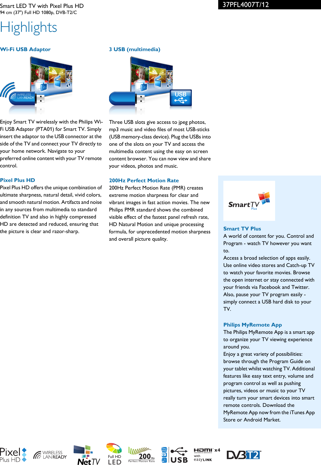 Philips 37pfl4007t 12 Smart Led Tv With Pixel Plus Hd User Manual